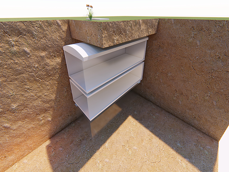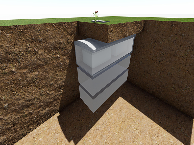 Sistema de sepultación bajo césped donde es depositada la urna dentro de un sarcófago individual de hormigón debidamente sellado y lápida familiar de mármol grabada.